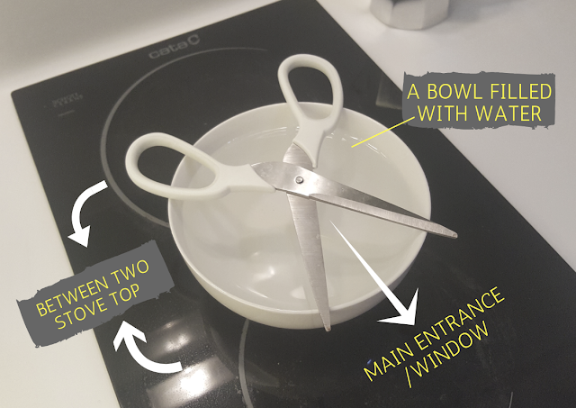 4. Open the scissors and put it on top of the bowl. Can be inside the bowl too if your bowl is bigger than the scissors.